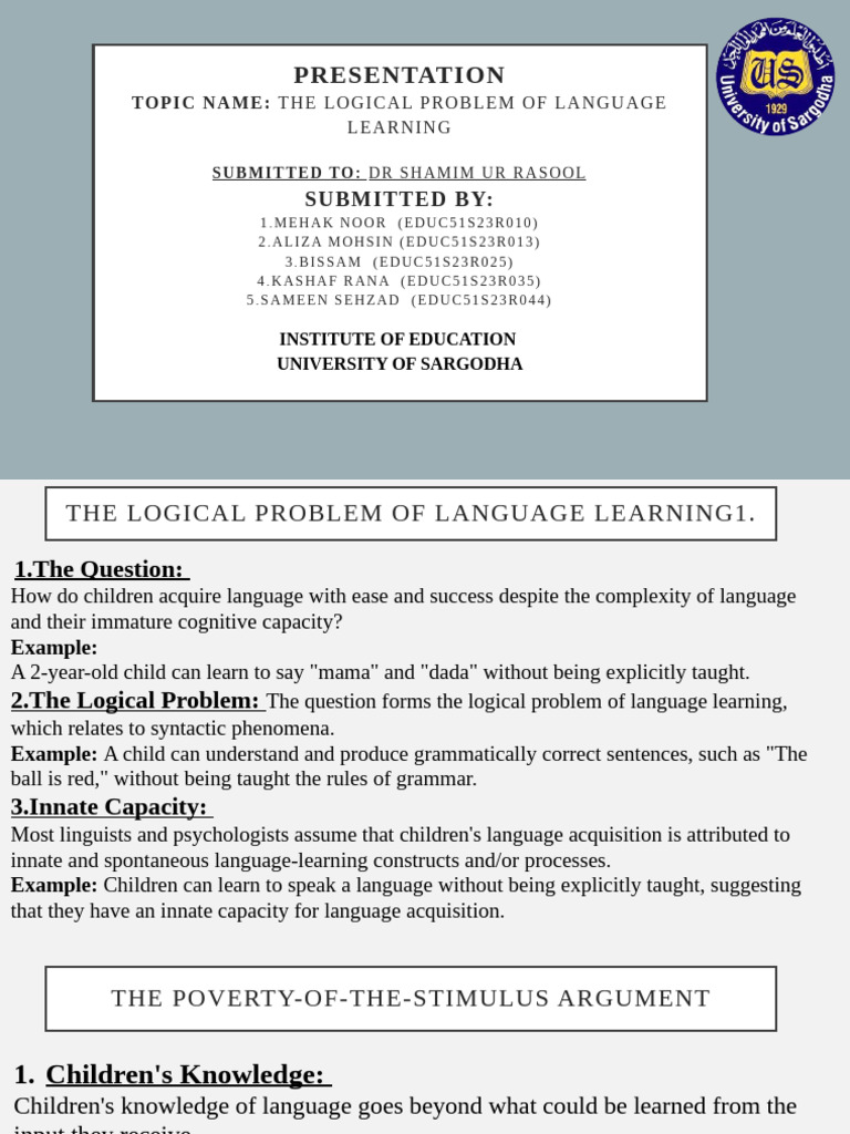 2.The Logical Problem: The question forms the logical problem of language learning,