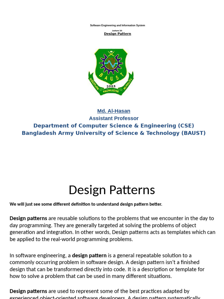 Design patterns are reusable solutions to the problems that we encounter in the day to