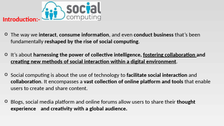 o Social computing is about the use of technology to facilitate social interaction and