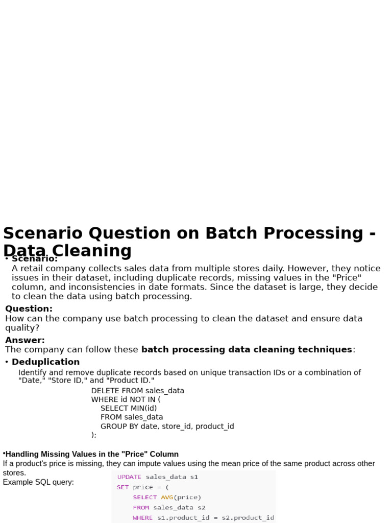 The company can follow these batch processing data cleaning techniques:
