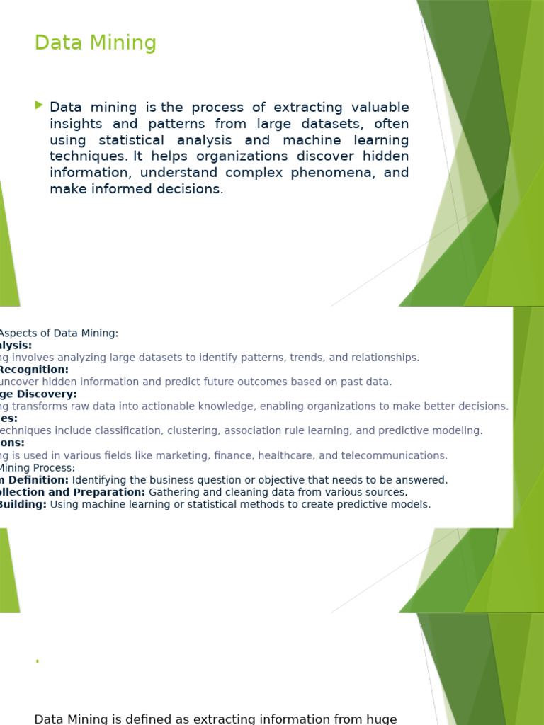ng involves analyzing large datasets to identify patterns, trends, and relationships.