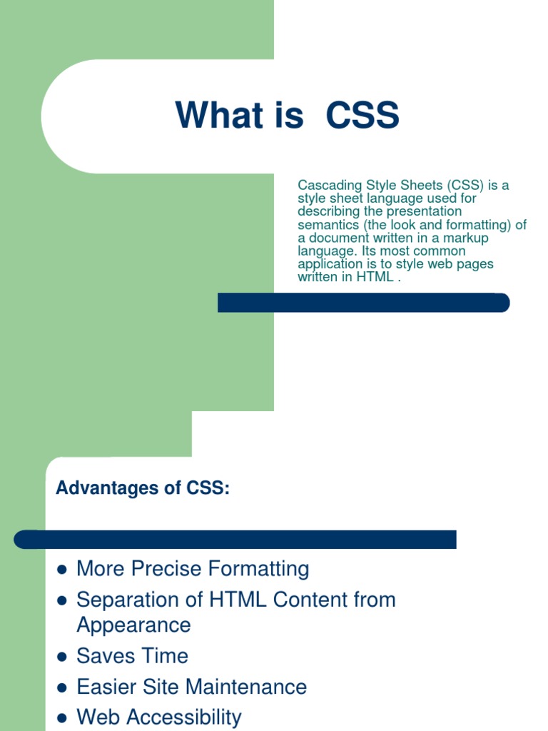 Cascading Style Sheets (CSS) is a style sheet language used for describing the presentation semantics (the look and formatting) of a document written in a markup language. Its most common application is to style web pages written in HTML .