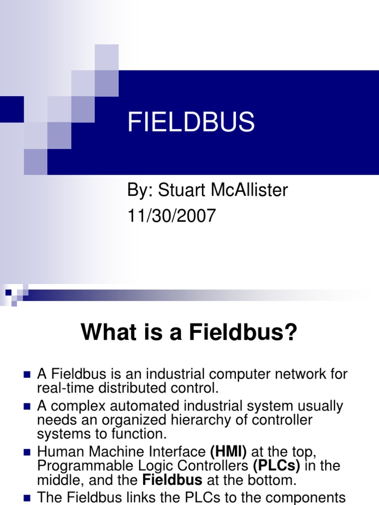 A Fieldbus is an industrial computer network for real-time distributed control. A complex automated industrial system usually needs an organized hierarchy of controller systems to function. Human Machine Interface (HMI) at the top, Programmable Logic Controllers (PLCs) in the middle, and the Fieldbus at the bottom. The Fieldbus links the PLCs to the components which actually do the work such as sensors, actuators, electric motors, console lights, switches, valves, and contactors.