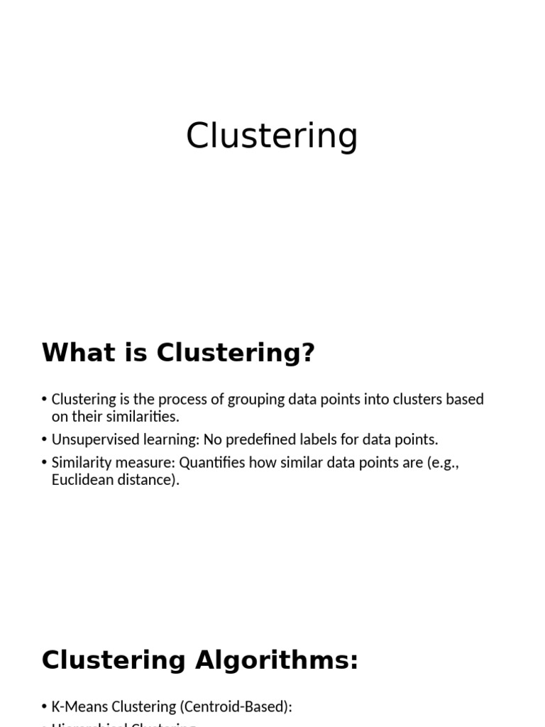 • Similarity measure: Quantifies how similar data points are (e.g.,