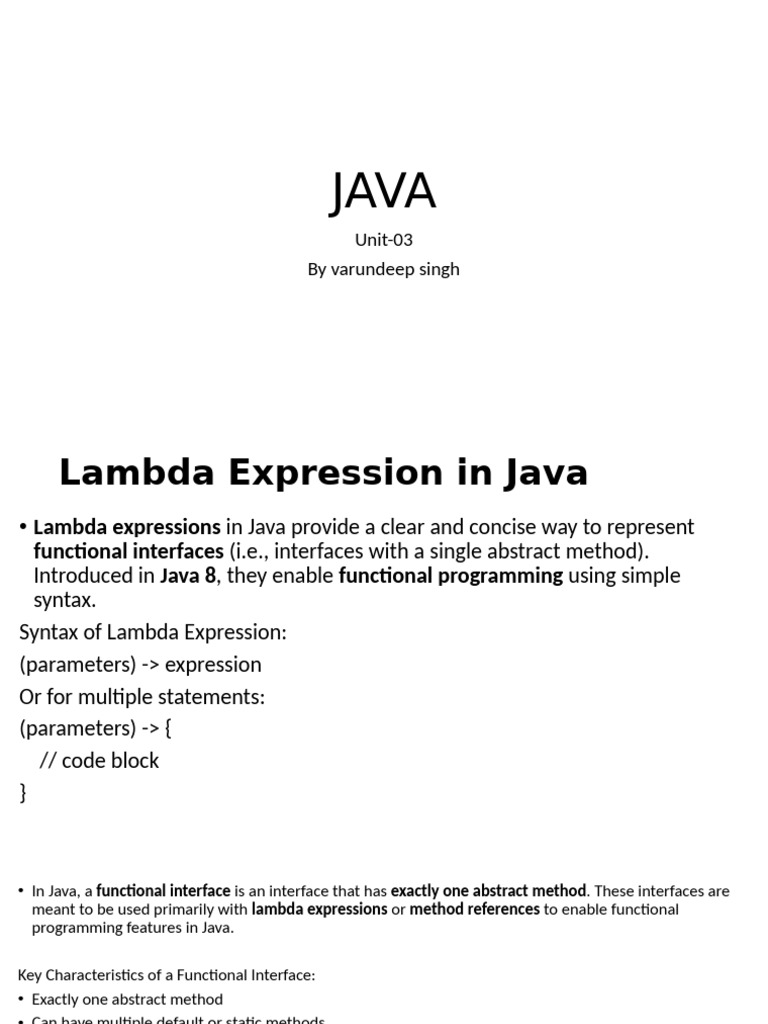 • Lambda expressions in Java provide a clear and concise way to represent