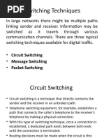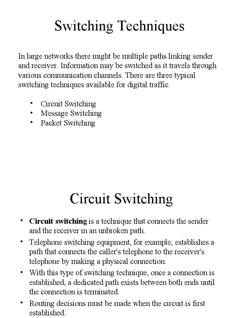 In large networks there might be multiple paths linking sender and receiver. Information may be switched as it travels through various communication channels. There are three typical switching techniques available for digital traffic. Circuit Switching Message Switching Packet Switching