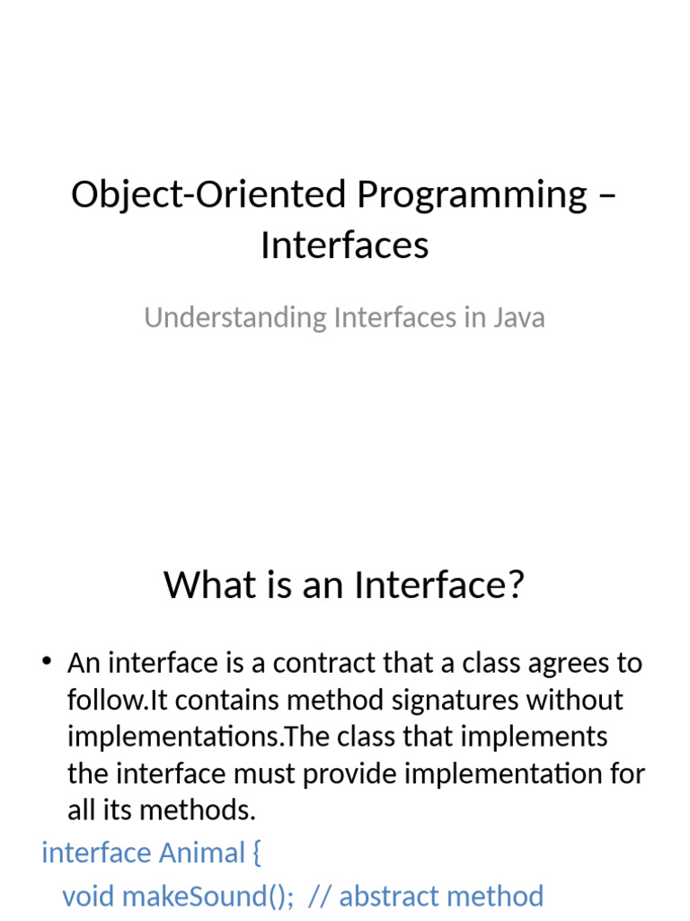 Purpose Defines a contract for what a class Provides partial abstraction and
