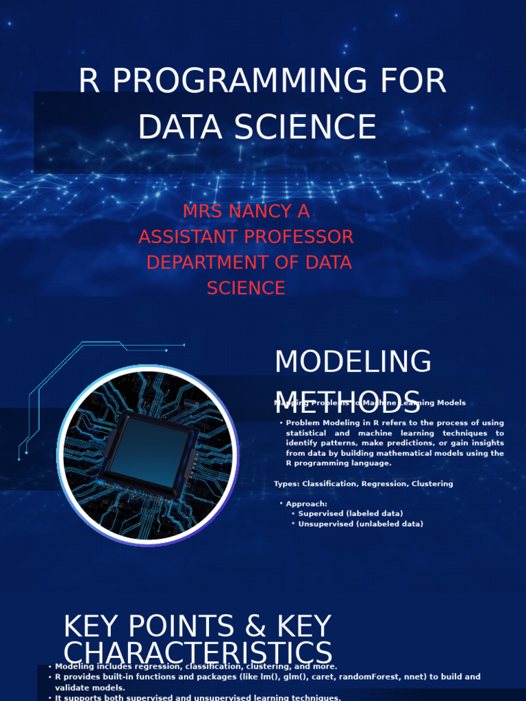 • R provides built-in functions and packages (like lm(), glm(), caret, randomForest, nnet) to build and