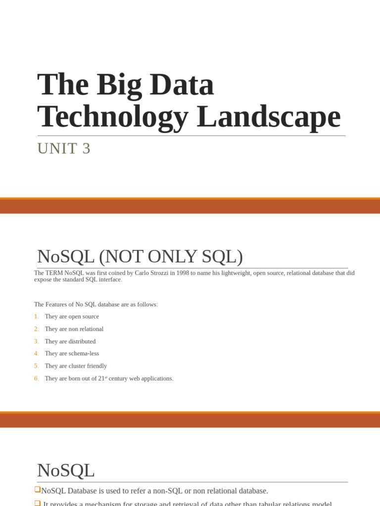 Examples: Oracle, MySQL, PostgreSQL Example: MongoDB, HBase, Redis, Couch DB