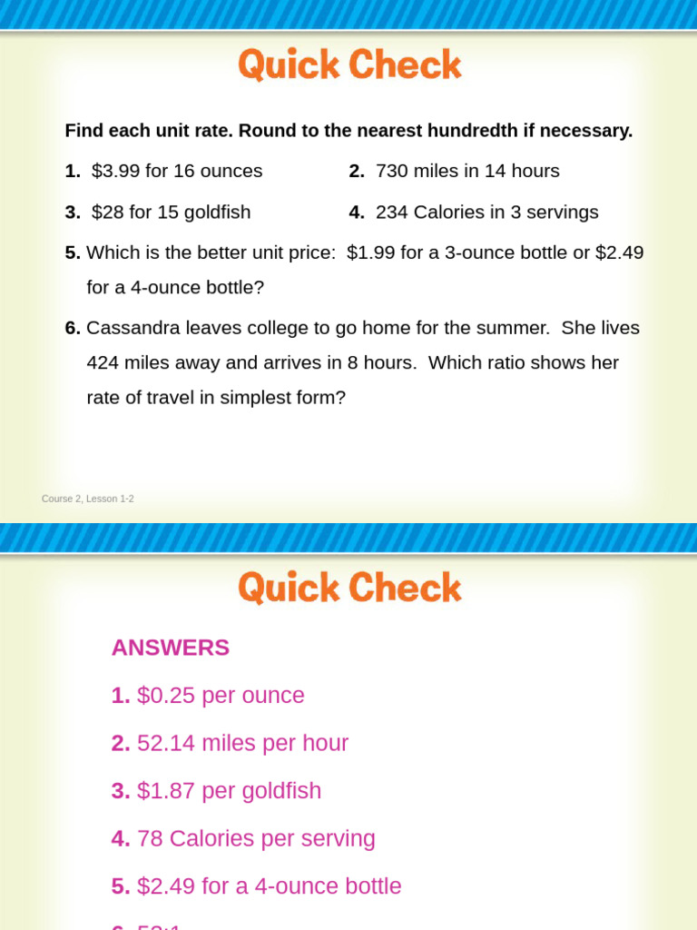 1. $3.99 for 16 ounces 2. 730 miles in 14 hours