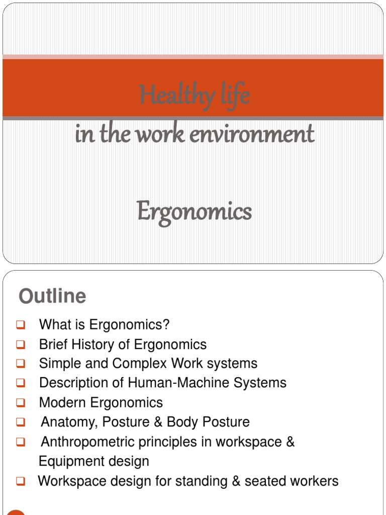 What is Ergonomics? Brief History of Ergonomics Simple and Complex Work systems Description of Human-Machine Systems Modern Ergonomics Anatomy, Posture & Body Posture Anthropometric principles in workspace & Equipment design Workspace design for standing & seated workers
