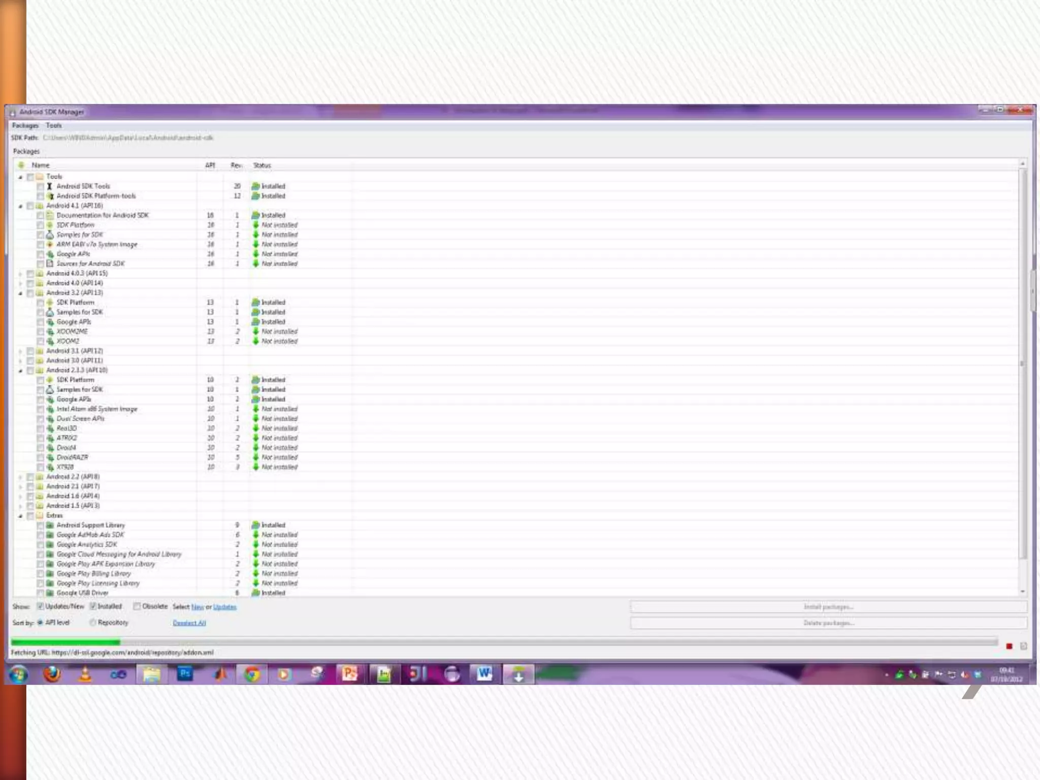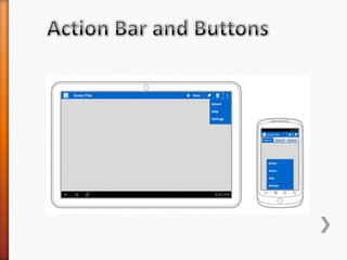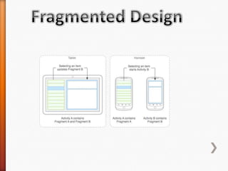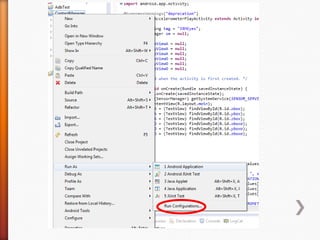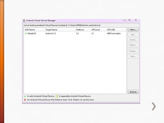 The document provides information about Android operating system. It describes that Android is an open source operating system based on Linux kernel maintained by Google. It allows hardware manufacturers to use it freely on their devices and provides a unified framework for software developers to build and distribute mobile applications. The document then explains Android software stack including Linux kernel, libraries, Dalvik Virtual Machine, application framework and applications layer. It also discusses installing Android SDK, setting up development environment in Eclipse or IntelliJ IDEs, and using emulators or real devices for testing applications.