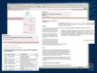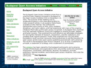 The document discusses open access to scientific literature. It defines open access as digital content that is free of charge and free of most copyright and licensing restrictions. It describes the benefits of open access as maximizing research visibility, usage, and impact. There are two main ways to achieve open access: self-archiving research articles in open repositories (the "green" route) or publishing in open access journals that do not charge subscription fees (the "gold" route). The document provides an overview of tools and standards that help implement open access institutional repositories, including the Open Archives Initiative Protocol for Metadata Harvesting (OAI-PMH).