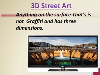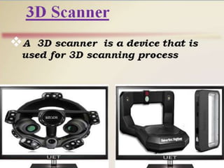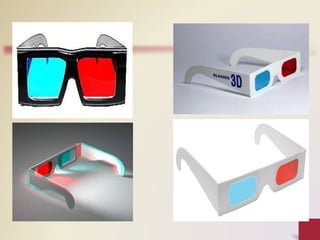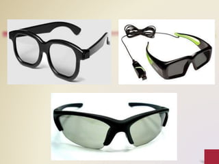 The document discusses various topics related to 3D technology including its history, how 3D images can be viewed using different types of 3D glasses, applications of 3D technology, and how 3D has changed our lives. It provides details on the evolution of 3D technology from early 3D movies in the 1920s to current uses in areas like 3D printing, gaming, and medical imaging. The key aspects of 3D technology covered are its ability to create the illusion of depth and how polarized lenses and different lens filters allow each eye to see a separate image that the brain combines into a 3D perception.