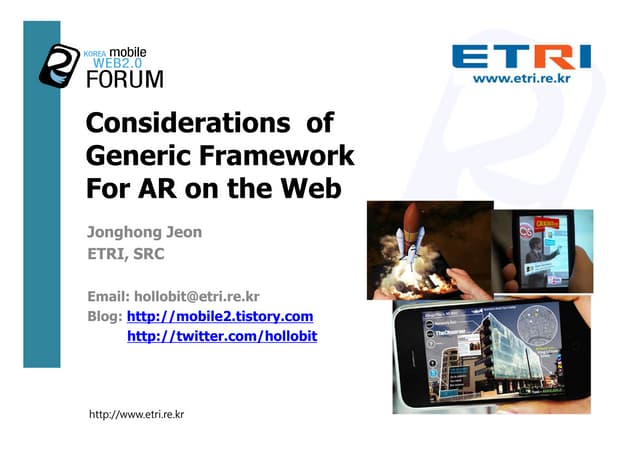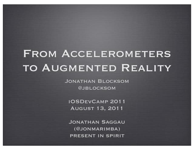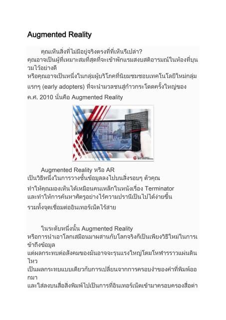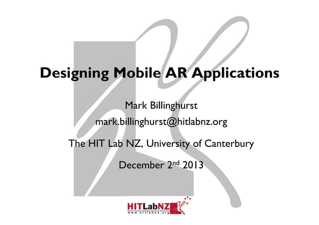 This document provides an overview of mobile augmented reality (AR) and its history. It discusses the evolution of mobile AR hardware from early handheld displays to today's camera phones. It covers important milestones like the first camera phone and early AR applications. It also summarizes key technologies like computer vision, tracking, and graphics libraries that enable AR on mobile. Overall, the document traces the development of mobile AR from early prototypes to its growing commercialization and adoption in recent years.