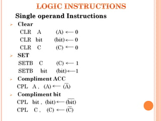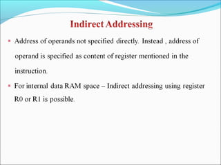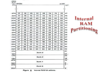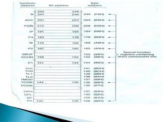 The document describes the architecture and instruction set of the 8051 microcontroller. It includes details about the memory map, internal data memory organization, special function registers, addressing modes, and common instructions. The 8051 has 4KB of on-chip ROM, 128 bytes of internal RAM, 21 special function registers, and supports operations on bytes, bits, and 16-bit data using various addressing modes like register, direct, indirect, and immediate addressing. Instructions allow data transfer, arithmetic, logic, and program control operations.
