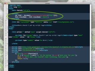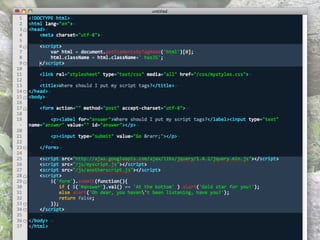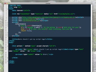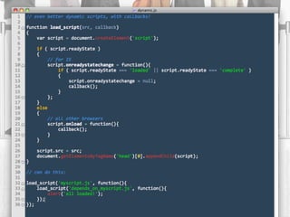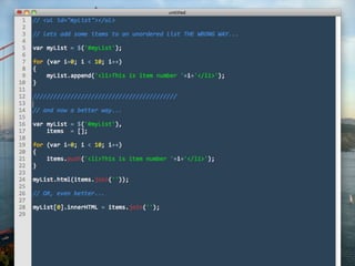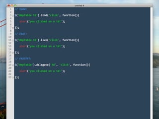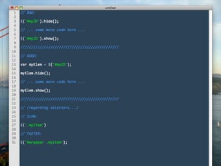 This document provides guidance on optimizing JavaScript performance. It outlines general principles and offers specific tips for improving load time performance and runtime performance. For load times, it recommends moving scripts to the bottom of the page, concatenating, minimizing, and gzipping files, and loading scripts in a non-blocking way. For runtimes, it advises being cautious of the DOM due to overhead, writing lazy code that does minimal work, and managing AJAX requests through caching, GET requests, and returning optimized data formats. Additional resources on the topic are also referenced.