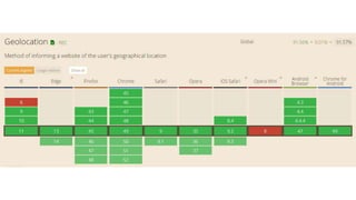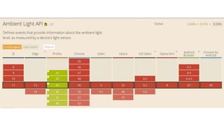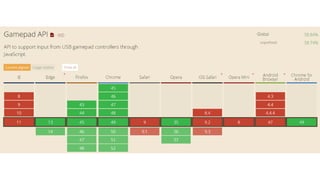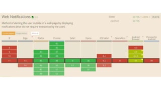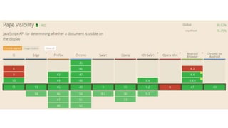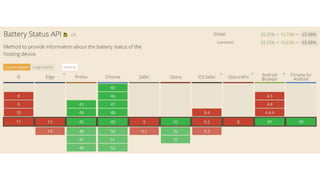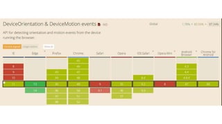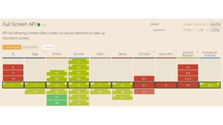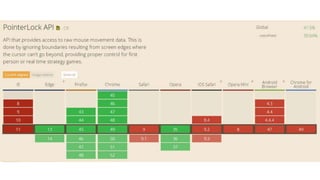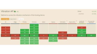 This document provides an overview of various HTML5 APIs related to multimedia and browser functionality, including features like the visibilitychange API, pointer lock API, full screen capabilities, and various mobile device APIs such as vibration, battery status, and Bluetooth. It details event handling, methods, and example code snippets for accessing and utilizing these APIs effectively. Additionally, the document includes information on the web audio API, geolocation API, navigation timing API, web speech API, and capturing audio and video through device integration.