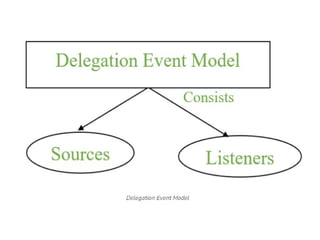 This document presents an in-depth exploration of event handling in Java, focusing on the delegation event model, event sources, and event listener interfaces. It categorizes events into foreground and background events, details various event classes such as ActionEvent and MouseEvent, and discusses the usage of adapter classes for simplifying event handling. Overall, it outlines how event handling facilitates user interaction with graphical user interfaces through well-defined mechanisms.