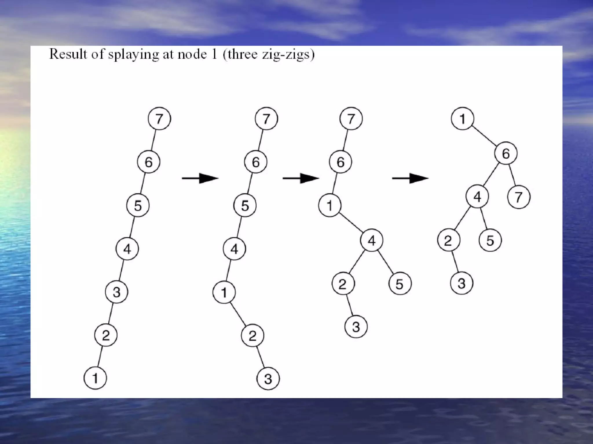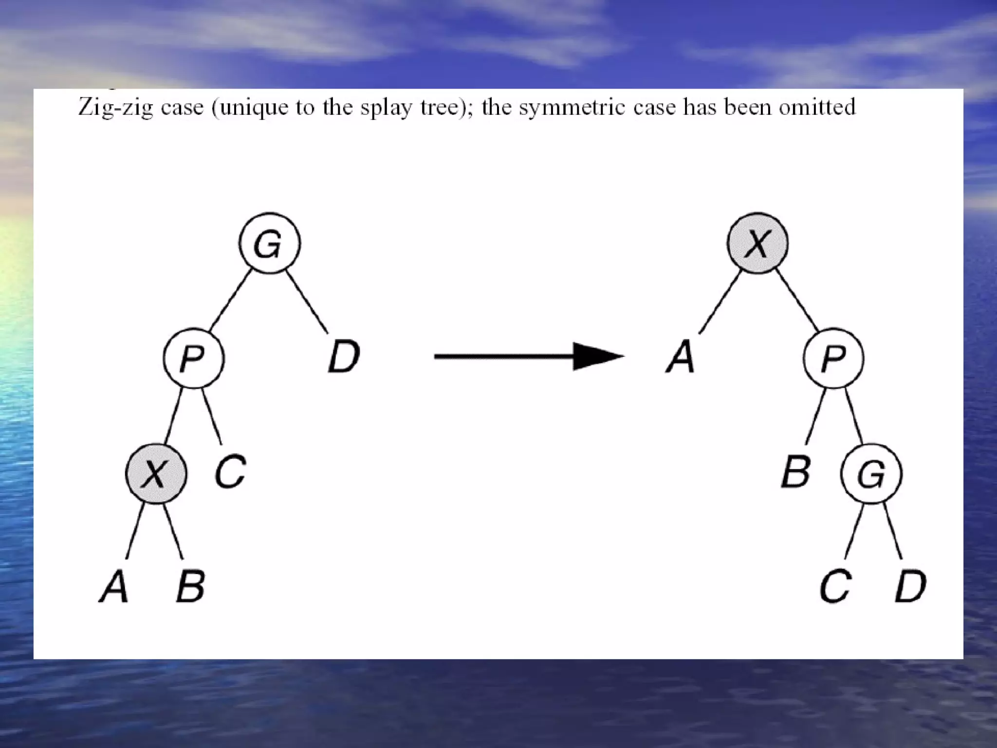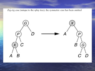 Case 3: Zig-Zag (Simplified) X L Y R X YL Z ZL R Y XR YL L Zr Z ZL XR Zr Thevalue to be splayed is in the tree rooted at Z. To make code simpler, the Zig-Zag rotation is reduced to a single Zig. This results in more iterations in the splay process.