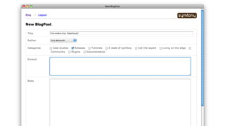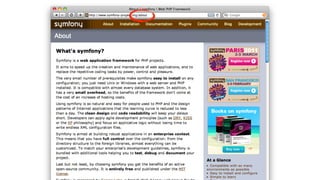 The document discusses advanced Symfony techniques, including host-aware routing, elegant authentication mechanisms, extra security features, JavaScript compression, and the handling of embedded forms. It highlights various plugins and the importance of community contributions for maintaining them, as well as offering specific coding strategies and examples related to Symfony 1.3 and 1.4. Additionally, the document emphasizes the need for translating Symfony documentation to enhance accessibility and understanding within the developer community.