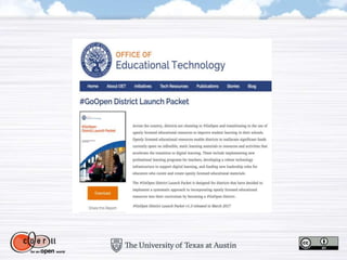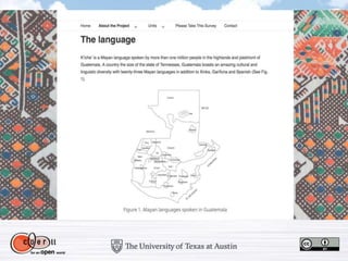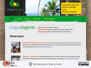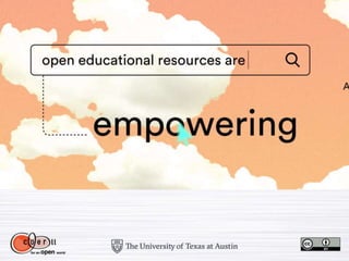 This document summarizes a presentation given by Carl S. Blyth from the University of Texas at Austin on the affordances of openness and open educational resources (OER) for foreign language materials in the 21st century. Blyth defines OER and open education, discusses the benefits they provide to students and teachers, and addresses some of the challenges of using OER, such as lack of awareness, need for training and support, quality control, findability issues, and sustainability concerns. The presentation provides an overview of how OER can help address the rising costs of educational materials while increasing access, adaptability, and opportunities for collaboration.