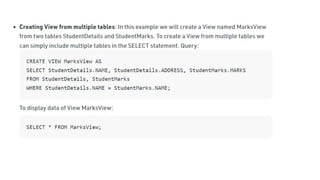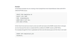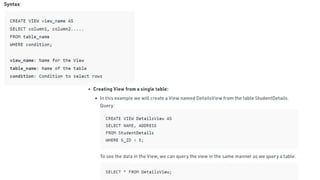The document discusses various SQL aggregate functions such as COUNT, SUM, AVG, MIN, MAX. It explains that aggregate functions perform calculations on multiple values from one or more columns and return a single value. The document also covers SQL views, joins, constraints and dropping constraints. It provides syntax examples for creating views, performing different types of joins (inner, left, right, full outer), and describes various constraint types like primary key, foreign key, unique key, not null.