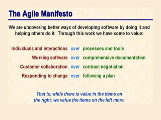 The document provides an overview of agile development, including its principles, types of agile methods, tools that support agile development, and when projects are well-suited to agile. It defines agile development as an iterative approach performed by self-organizing teams to produce high-quality software through early delivery and response to changing needs. The principles emphasize things like customer satisfaction, frequent delivery, collaboration, trusting motivated individuals, and responding to change.