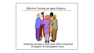 The document outlines agile testing methodologies and their advantages, emphasizing the need for early defect detection and customer-centric quality delivery. It describes various testing approaches, including Behavior Driven Development (BDD), Acceptance Test Driven Development (ATDD), and exploratory testing, while advocating for continuous collaboration between testers and developers. Furthermore, it highlights the future importance of communication, skill diversity, and a business mindset for testers in agile environments.