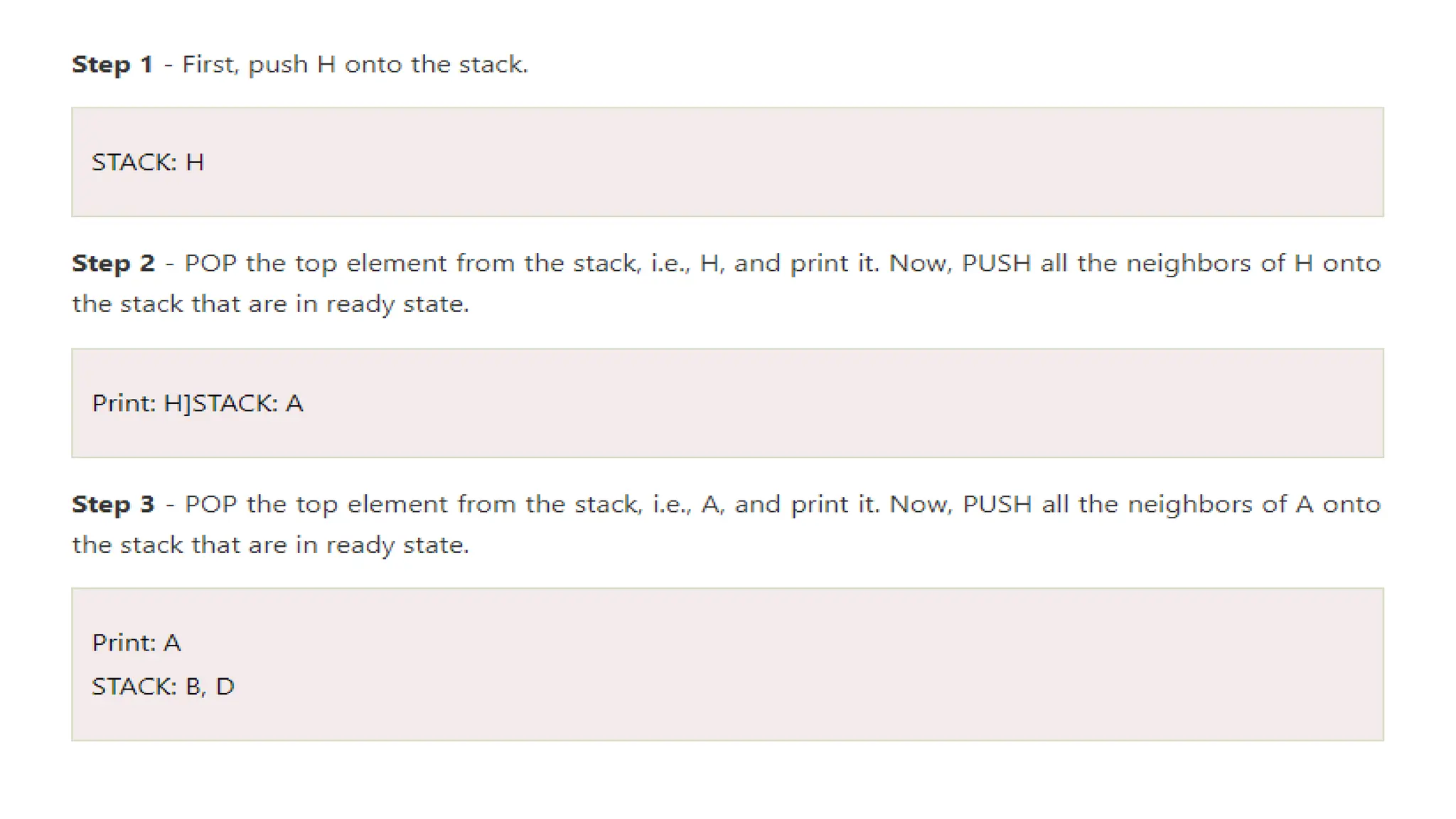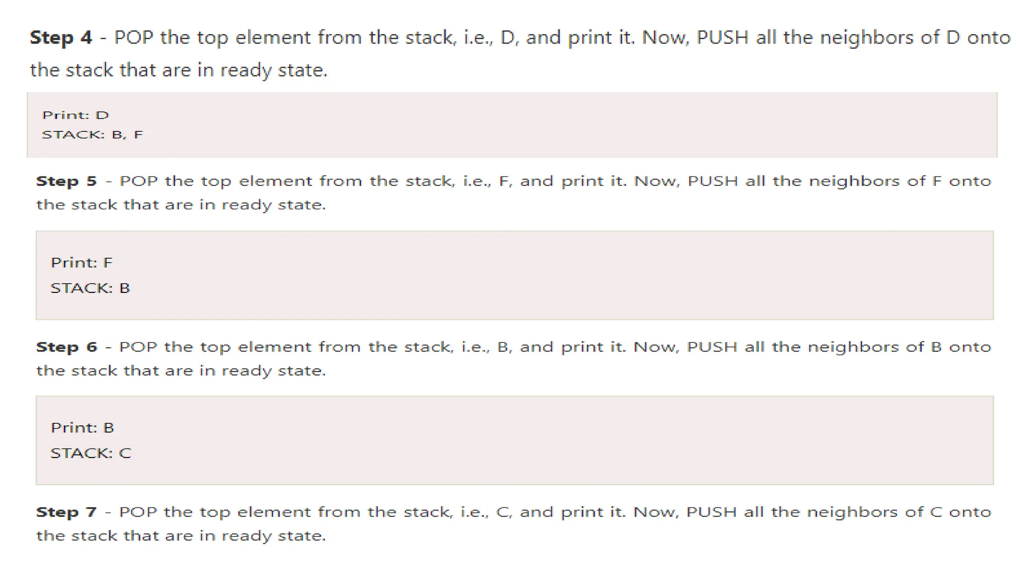 Step 3: Repeat Steps 4 and 5 until STACK is empty