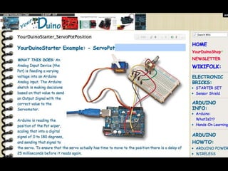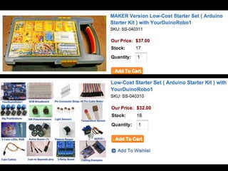 • #37 SO, how can YOU make these kinds of things happen for kids today?? How can YOU get started to use Arduino to spark curiosity and creativity in young people? Mainly Just Do It! Get your hands on a Starter Set for as little as $32 plus shipping. Good learning materials are on the http://ArduinoInfo.Info WIKI here: