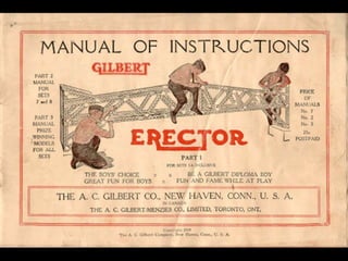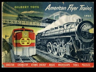 • #8 When I was a kid, I knew an interesting old man. He lived in our town and my friend Mark's father Dick Landers worked for him. Sometimes on Sunday we would go down to the factory and poke around... The old man would be puttering around the place everywhere. He let us do lots of stuff. He was kinda gruff, but he didn't seem to mind at all that we were just kids. He let us weld stuff with the spot welder, and dust powdered metal into the stamping press that made the wheels for the American Flyer trains. You could break them with your fingers before they went thru the sintering oven. Of course we got to run the biggest American Flyer train layout ever, in the showroom! But what we really loved was all those bins of PARTS back in the factory. Part to make Erector Sets. Parts to make American Flyer trains. The old man would reach into some bin and pull out some part. "Hey, kid, What's this??", he'd say, as he reached into some bin. Out would come the armature for a diesel railroad locomotive. We built some trucks up out of parts. They went like heck just by themselves on the track. Eventually we had a roller coaster track in Mark's room. We told the Old Man we knew why he called them American Flyer after we put two transformers in series on them in Mark's Room. He and Dick looked at each other and laughed. Mark said he knew why the Old Man's name was A.C. too. They laughed a lot at that one!   Much later I found out that About 3 years before Mark and I started hanging out at the factory, the old man had said this: