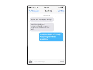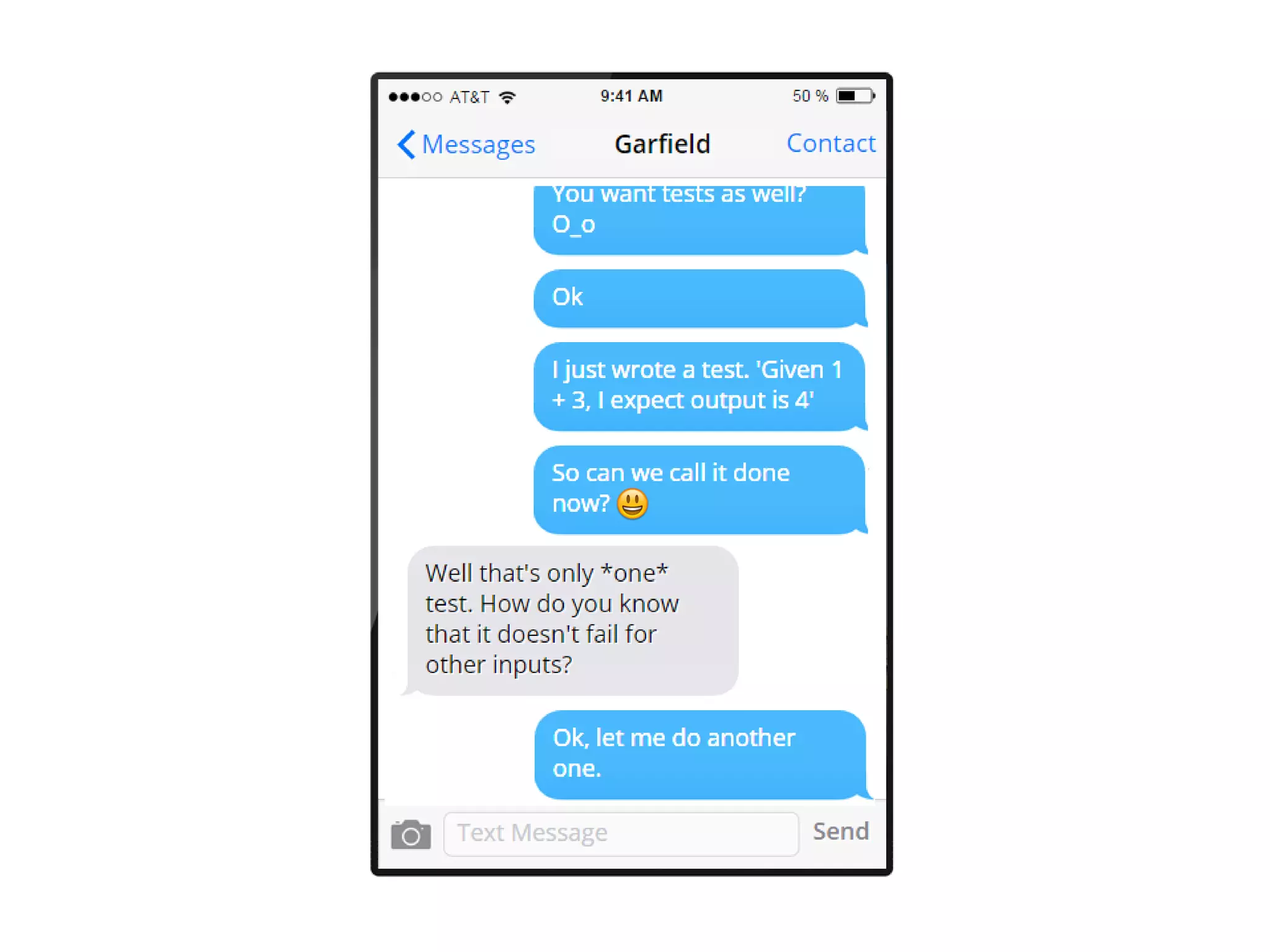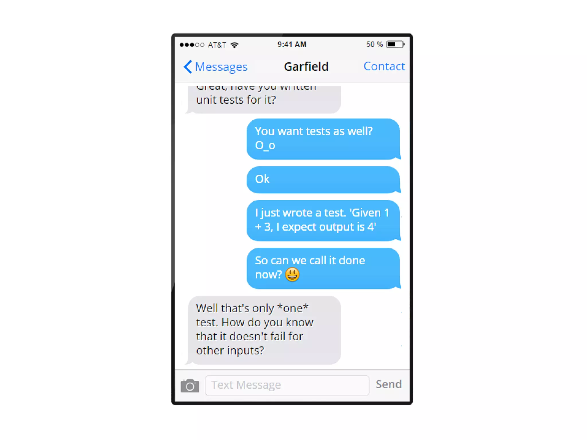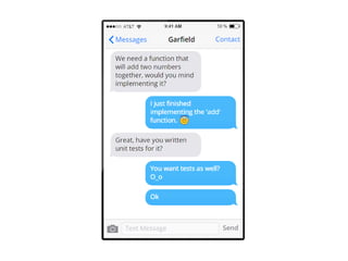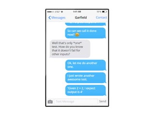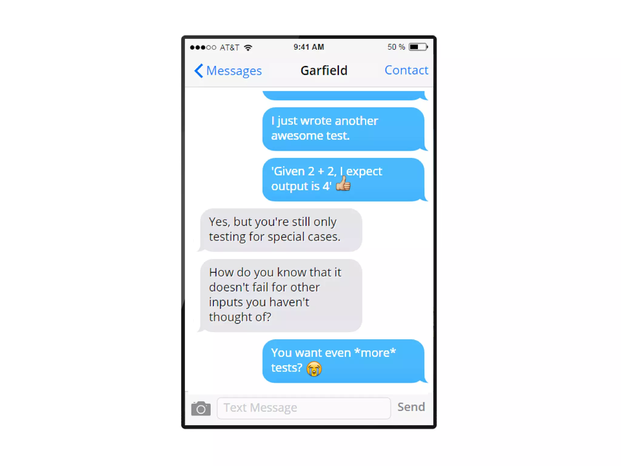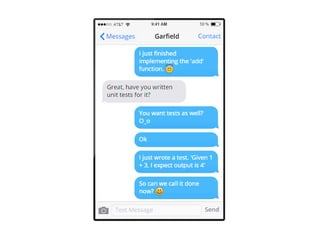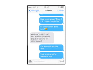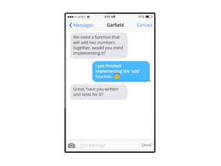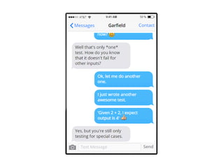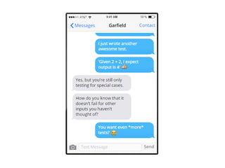 The document discusses the concept of property-based testing, illustrating how it can be applied to create robust unit tests for an 'add' function through usage of random inputs and defining properties like commutativity and identity. It emphasizes the importance of understanding the requirements of functions deeper than traditional example-based tests, enabling users to detect faulty implementations more effectively. Additionally, the text covers tools like 'quickcheck' that facilitate property-based testing in various programming environments.