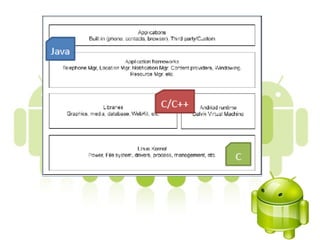 Android is an open-source operating system developed by Google and the Open Handset Alliance. It uses Linux as its kernel and is designed primarily for touchscreen mobile devices such as smartphones and tablets. The Android platform includes an operating system, middleware, and key applications. Some key facts about Android include that it uses the Java programming language and is powered by an open-source Linux kernel. Android versions are named in alphabetical order and include versions like Cupcake, Donut, Eclair, Froyo, and more. Android devices must meet minimum requirements to run the OS and Android provides features like multitasking, connectivity options, media support and more. It has a large market share worldwide and runs on various devices beyond smartphones like