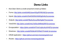 The document provides an overview of Angular 2 and TypeScript, highlighting the key aspects including the architecture, building blocks, and various features such as components, services, and directives. It also notes that Angular 2 is still in a release candidate stage and emphasizes the importance of TypeScript as a typed superset of JavaScript. Additionally, the document includes links to demos and resources for further exploration of Angular 2 functionalities.