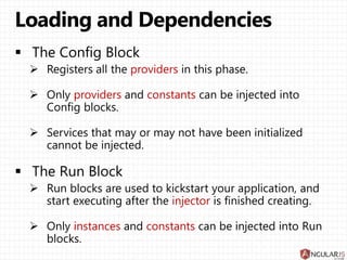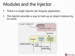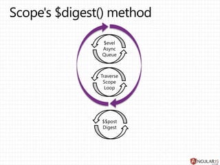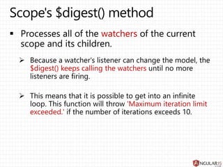 AngularJS uses a compile process to link directives and scopes. During compilation, it executes factory functions, template functions, compile functions, controllers, pre-link functions and post-link functions for each directive. This process recursively compiles child elements. The compiled output can then be linked with a scope during the linking phase to instantiate the directive.