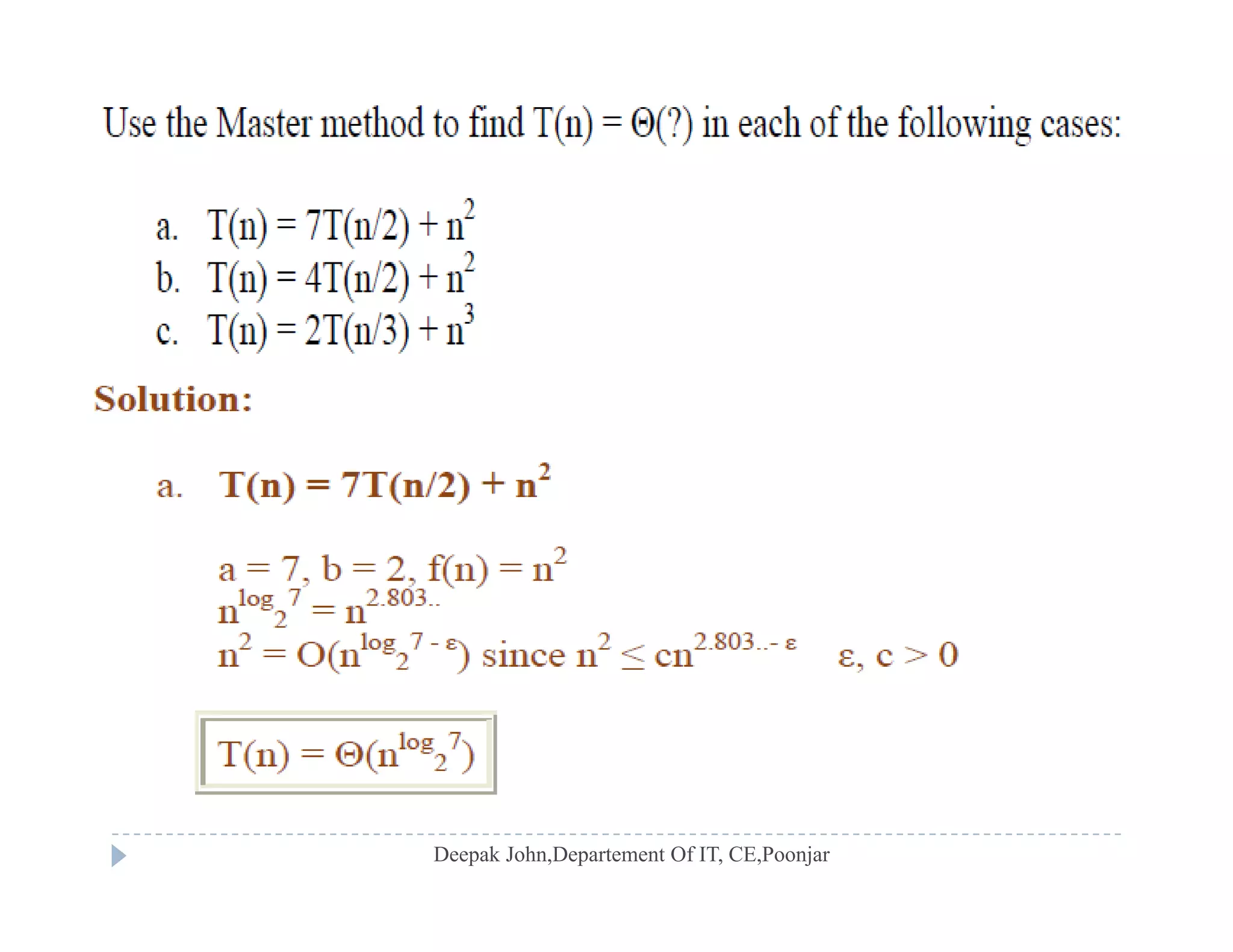 Application of Master Theorem to analyze recurrences, examples provided with different cases.