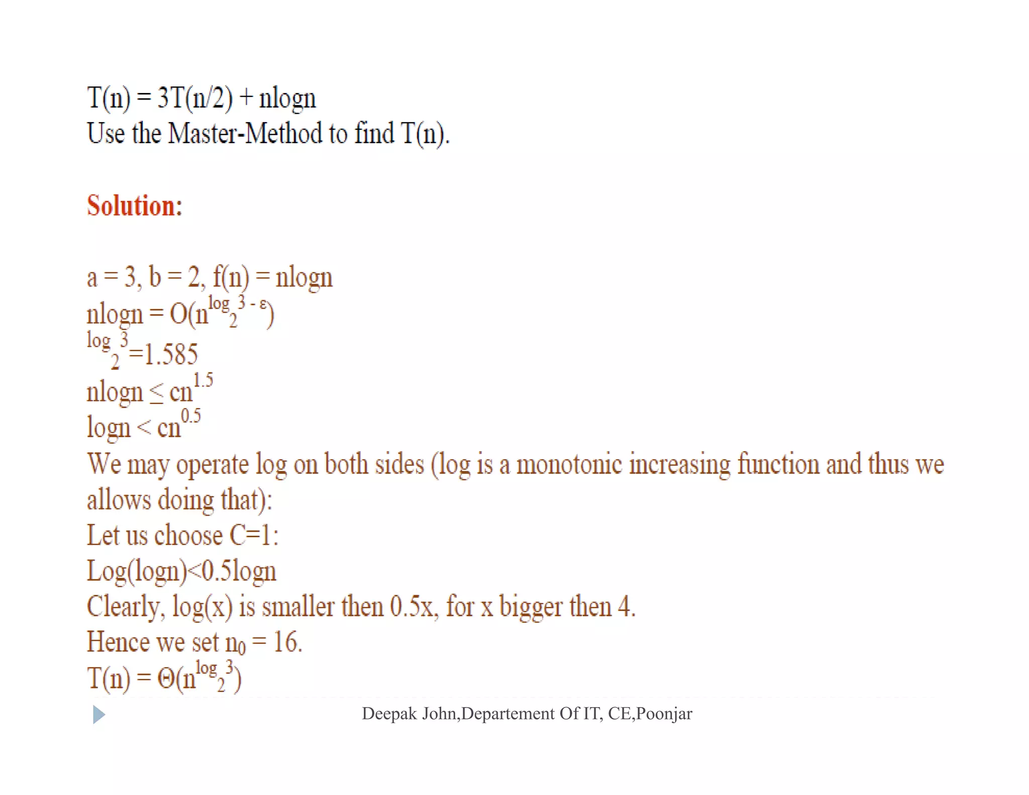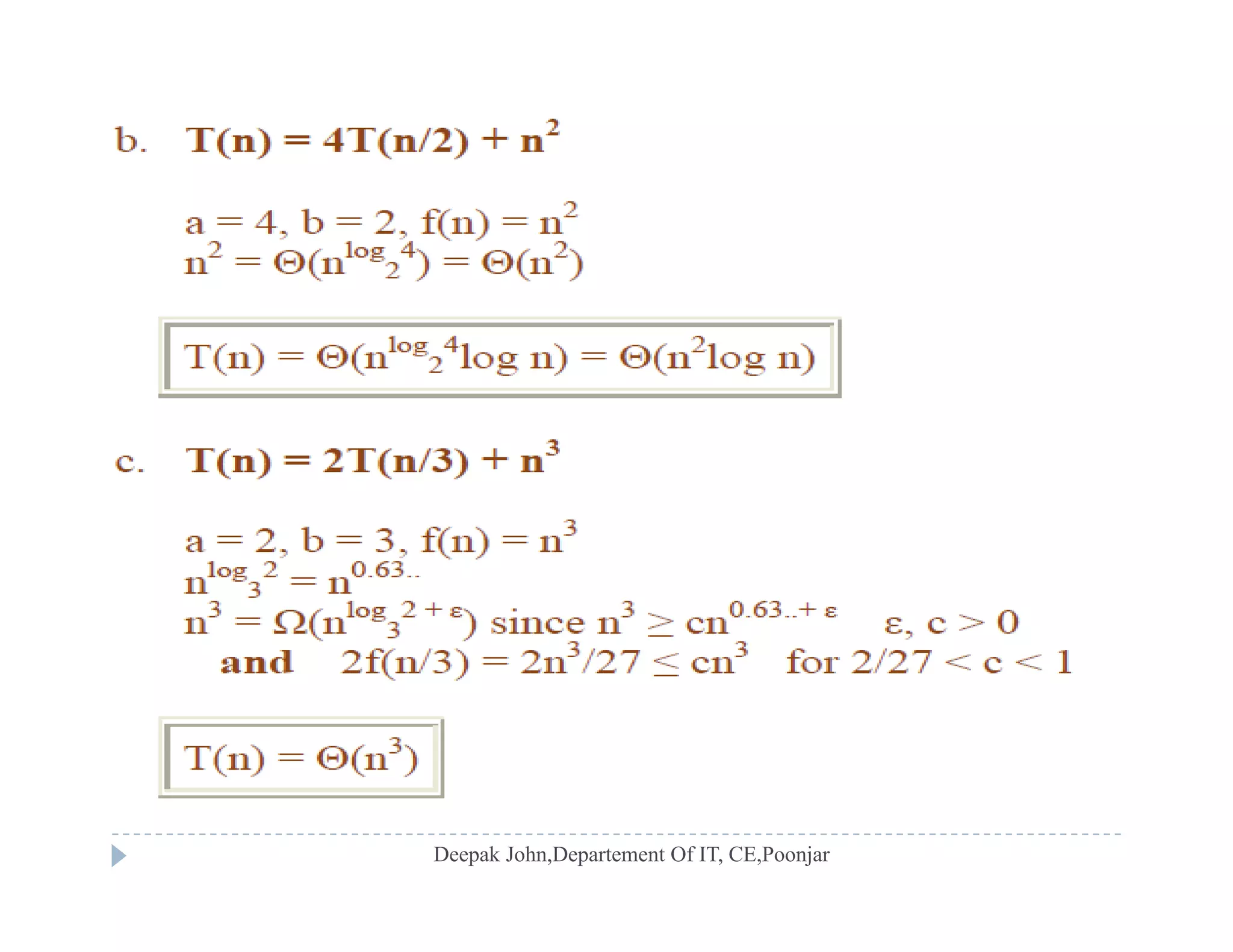 Techniques for solving recurrence relations, including substitution and tree method approaches.