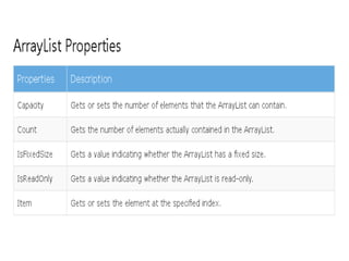 The document provides a comprehensive overview of arrays and collections in C#, including simple, multidimensional, and jagged arrays, as well as the Array and ArrayList classes. It covers array declaration, initialization, accessing elements, and methods provided by the Array class for manipulation. Additionally, it highlights differences between traditional arrays and ArrayLists, emphasizing the dynamic resizing capability of the latter.