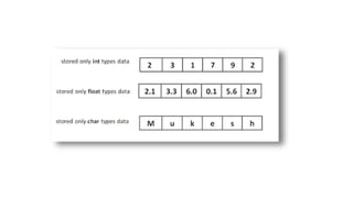 Arrays allow storing multiple values of the same data type in contiguous memory locations. One-dimensional arrays store elements in a single list, accessed by index. Multi-dimensional arrays organize elements into multiple lists, accessed by multiple indices. Arrays can be initialized manually or by user input, and traversed with for loops to access each element sequentially.