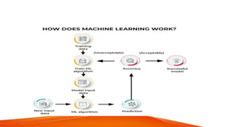 This document provides an overview of artificial intelligence (AI) and machine learning. It begins with definitions of AI and discusses how people commonly interact with AI systems like search engines and virtual assistants. It then describes the three phases of computing and the shift to the current AI computing era. The document outlines why AI is important for automation, decision making, personalization and other applications. It also discusses the main types of AI as strong/narrow AI and weak/general AI. The relationship between AI, machine learning, and deep learning is explained. The document concludes with introductions to machine learning and its key concepts like data, features, labels and common Python libraries. It also covers the main types of machine learning as supervised, unsupervised and