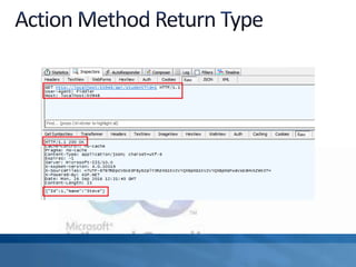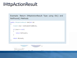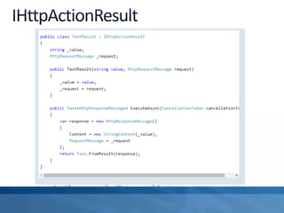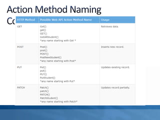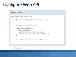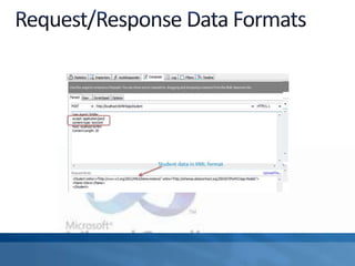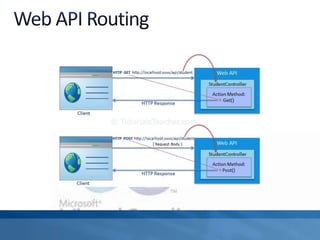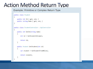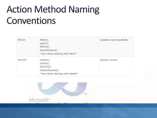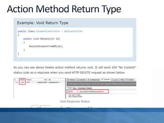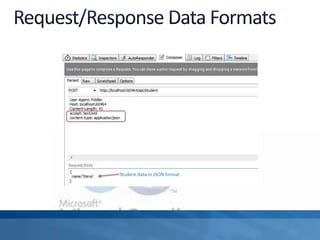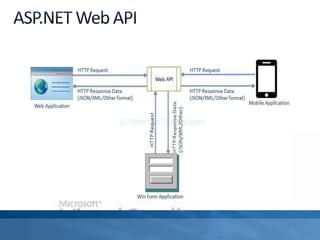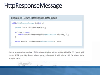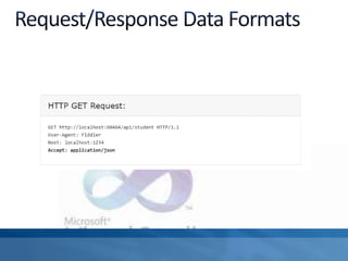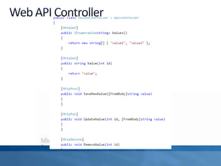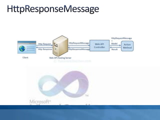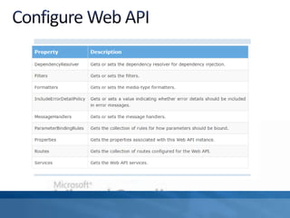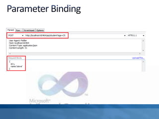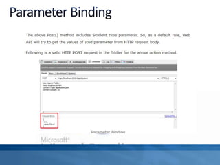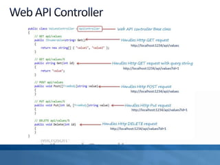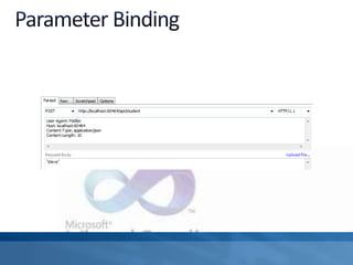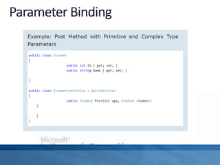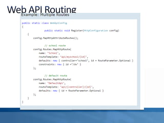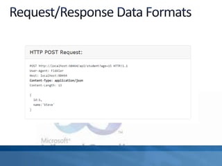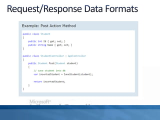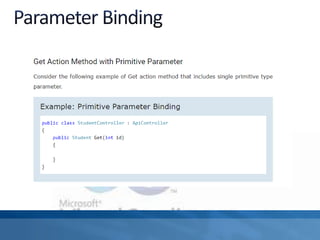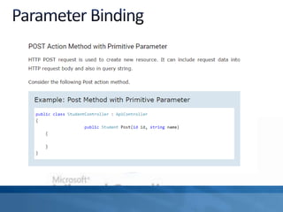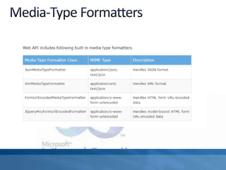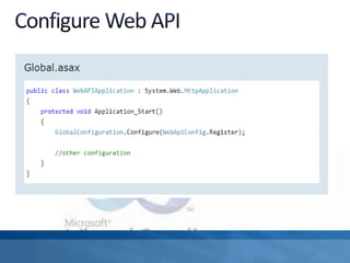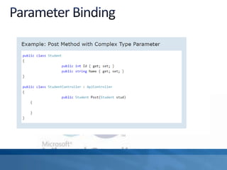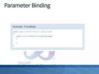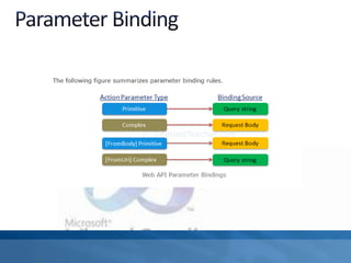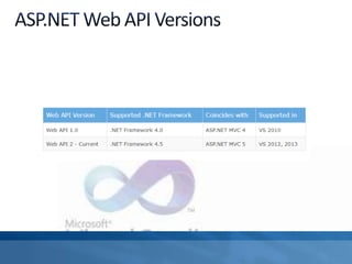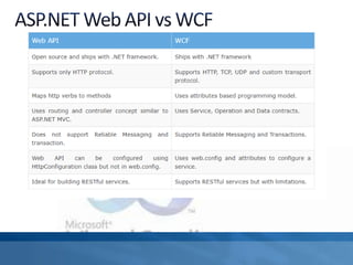 The document discusses ASP.NET Web API, which is a framework for building HTTP services that can be accessed from various applications and platforms. It supports building RESTful services and maps HTTP verbs to action methods. Web API supports JSON, XML, and BSON formats and can be self-hosted or hosted in IIS. Choosing between Web API and WCF depends on requirements around supported protocols, message exchange patterns, and framework versions. Web API uses controllers and routing to handle requests. It supports configuration, parameters, and custom result types. Media types and formatters are used to serialize requests and responses.