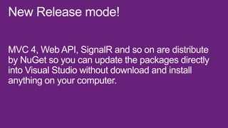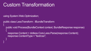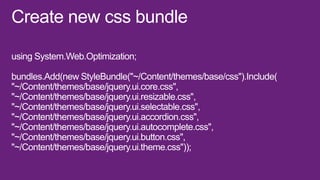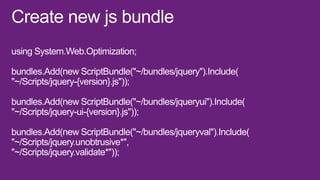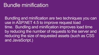 This document is a presentation about Visual Studio 2012 for web developers. It discusses how bundling and minification of files can improve performance metrics like file requests, bandwidth usage, and load times. Specifically, using bundling and minification reduced file requests by 256%, KB sent by 266%, KB received by 36%, and load time by 53% compared to not using these techniques. The document also provides contact information for the presenter.