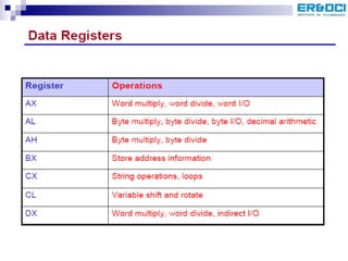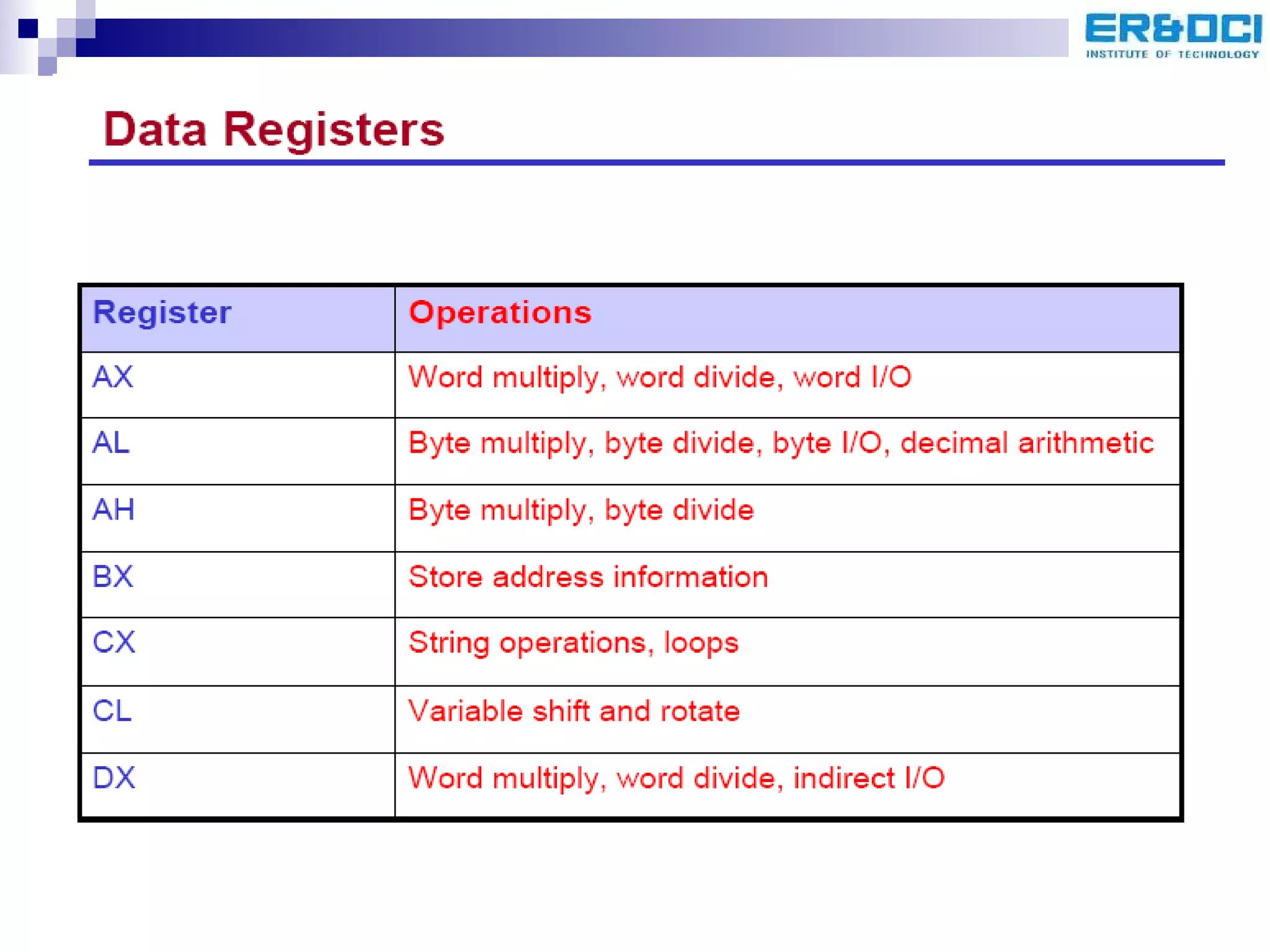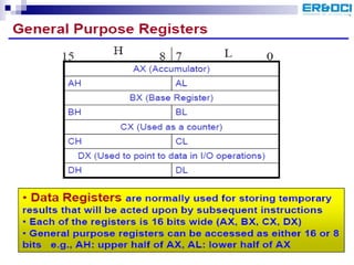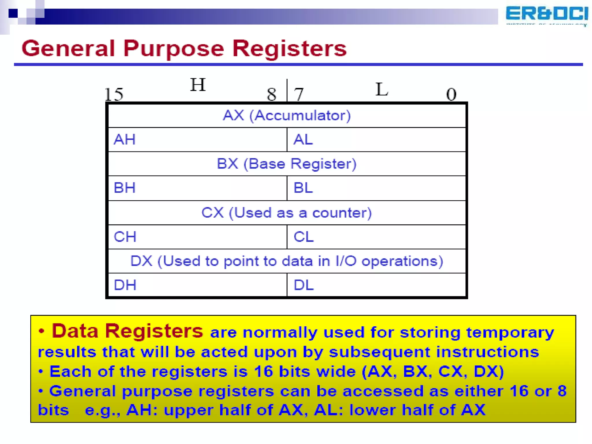 General registers General registers are the mostly used. They all can be broken down into 16 and 8 bit registers. 32 bits : EAX EBX ECX EDX 16 bits : AX BX CX DX 8 bits : AH AL ,BH BL, CH CL, DH DL EAX, AX, AH, AL : Accumulator register. It is used for I/O port access, arithmetic, etc. EBX, BX, BH, BL : Base register. It is used as a base pointer for memory access. ECX, CX, CH, CL : Counter register. It is used as a loop counter and for shifts. EDX, DX, DH, DL : Data register. It is used for I/O port access, arithmetic, some interrupt calls.