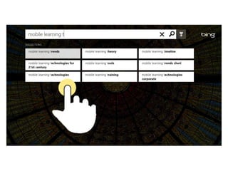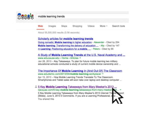 The document discusses the evolution of mobile learning (mLearning) and its significance in the current digital landscape. It emphasizes the rapid adoption of mobile technology and suggests that learning materials must be simplified and optimized for mobile devices to enhance user experience. The focus is on creating engaging, lightweight content that leverages mobile's unique features, encouraging educators and content creators to embrace a mobile-first approach.