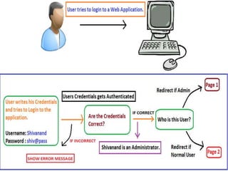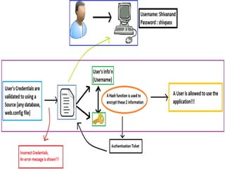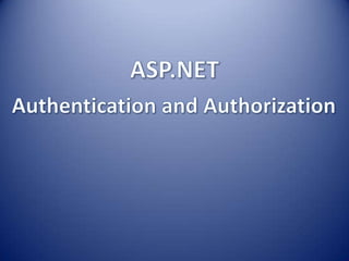 The document discusses the importance of security in web applications, outlining various methods of authentication and authorization, including forms, Windows, and passport authentication. It explains key concepts such as identity and principal objects, and highlights the functions of Internet Information Services (IIS) for hosting ASP.NET applications. Additionally, it covers best practices for securing applications against potential threats and attacks.