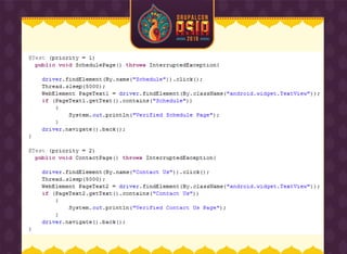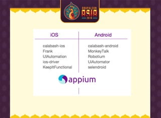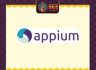This document discusses the need for automated mobile application testing and introduces Appium as a tool to perform such testing. It provides an overview of Appium, including that it is open-source, cross-platform for Android and iOS, supports various programming languages, and can test native, hybrid and mobile web apps. It also provides basic instructions on getting started with Appium and includes screenshots of the Appium user interface and a sample test script.