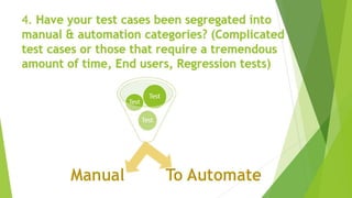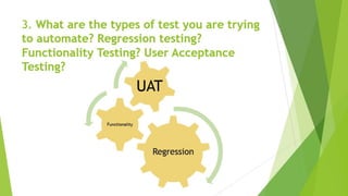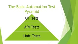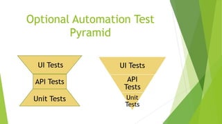 The document provides a comprehensive guide on QA automation tests using Selenium, covering the basics of automation, project setup, coding, and design. It includes instructions on installing necessary tools, creating a project using Maven, and writing automation tests with various Selenium selectors. Additionally, it discusses best practices for handling test failures and includes details about different testing frameworks and methods for element interaction.