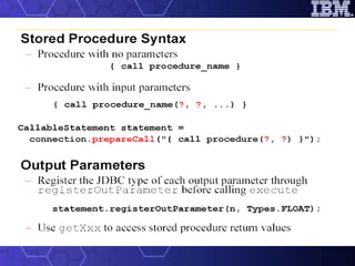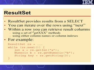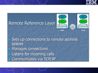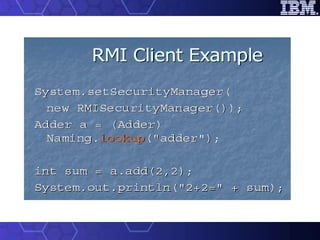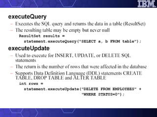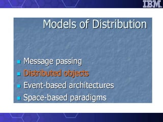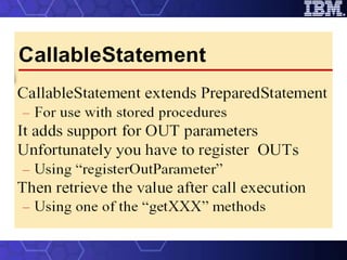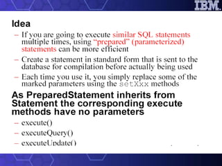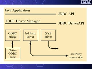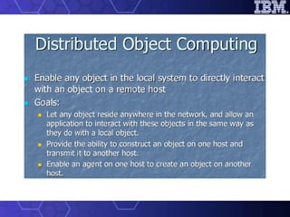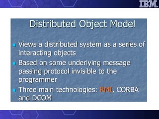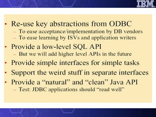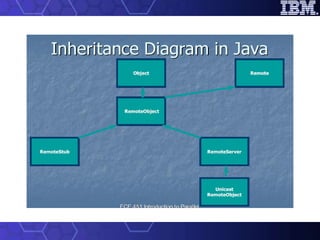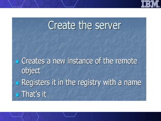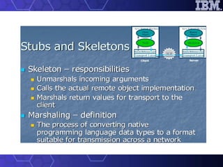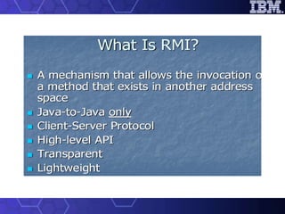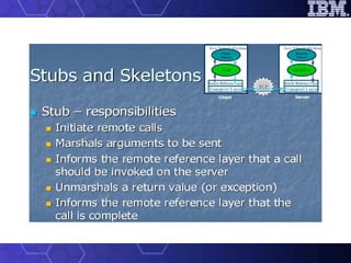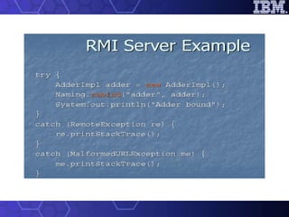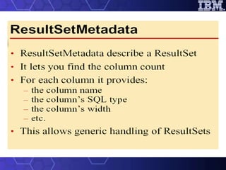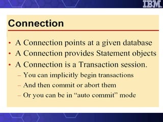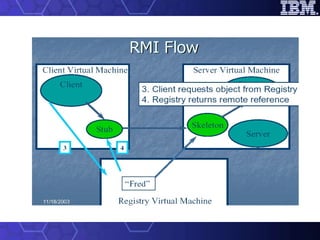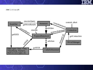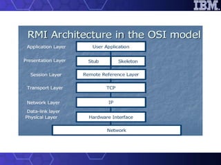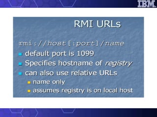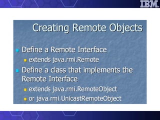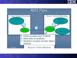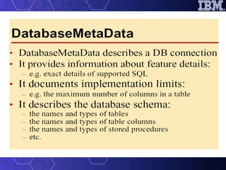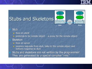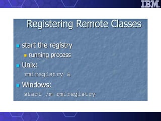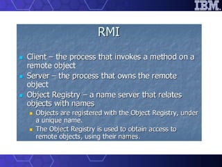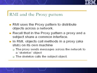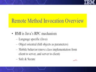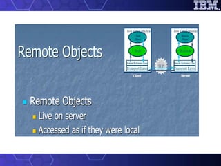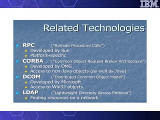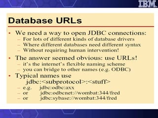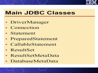 The document discusses Java Beans, Applets, JDBC, Networking in Java, JNDI, and some key classes used in these technologies. It provides an overview of concepts like Java Beans components, properties, events, introspection, customization, persistence. It describes the lifecycle and methods of Applets. It outlines the basic steps to use JDBC like loading drivers, establishing connections, executing queries. It discusses connection-oriented and connectionless networking in Java and common network classes like Socket, ServerSocket, URL, URLConnection. It provides a high-level overview of the JNDI architecture.