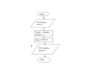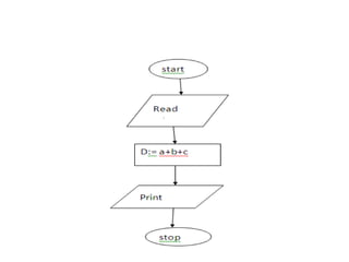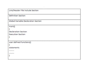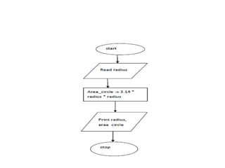 The document provides an introduction to flowcharts and C programming, detailing symbols used in flowcharts and algorithms for basic operations like addition and area calculations. It explains the structure of C programming language, including components such as header files, the main function, variable declarations, data types, and input/output functions. Additionally, it covers keyword usage, identifier rules, commenting, and specific syntax for formatted and unformatted input/output functions.
